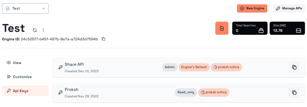 You should see the API keys accessible to you along with their permissions. As you can see, one of the keys has Admin rights while the other has Read\_only rights. So, for this particular Engine, we can use the "**Share API**" key because it has "**Admin**" rights.