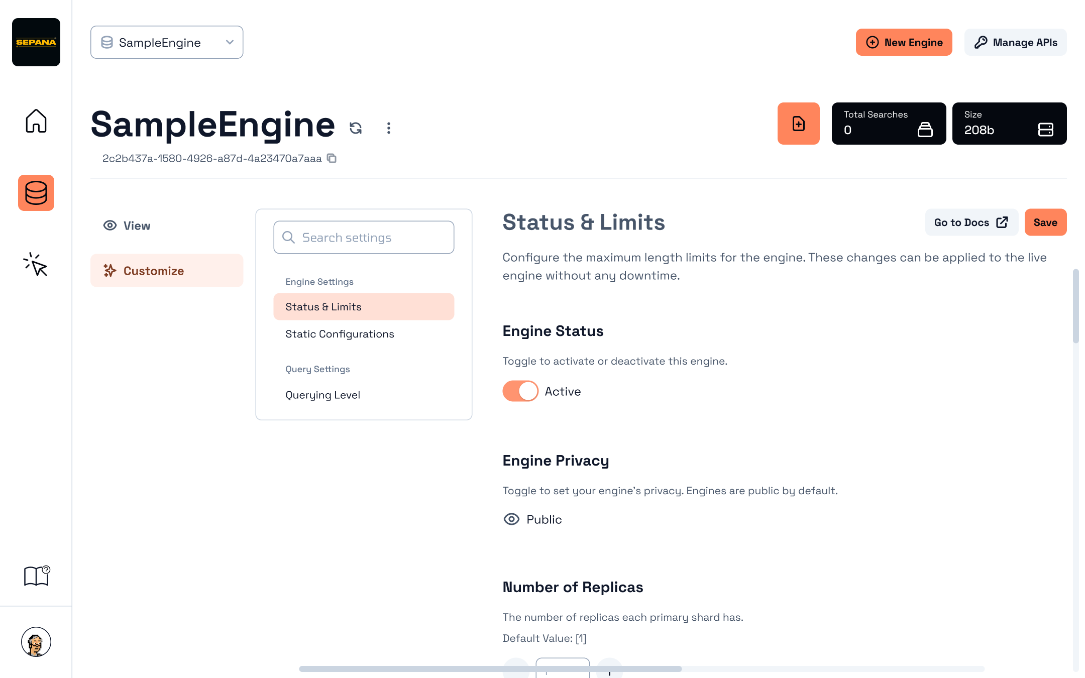 To navigate to engine customization, switch from the **"View"** tab to the **"Customization"** on the left side of your engine page.
